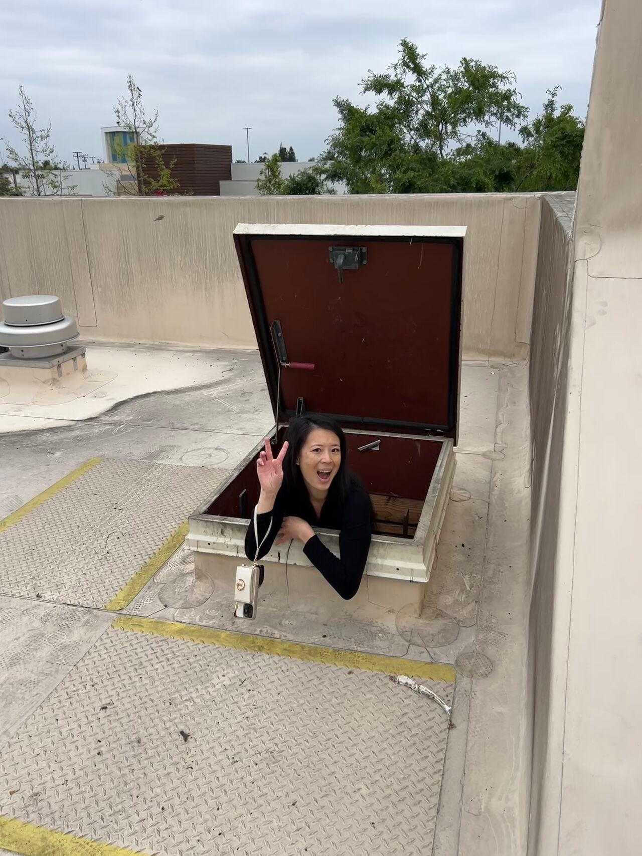Here’s a picture of Dana going up the ladder to the roof in high heels.